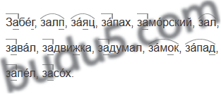 Забег, залп, заяц, запах, заморский, зал, завал, задвижка, задумал, замок, запад, запел, засох.