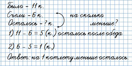 3. Мама поджарила 11 котлет. За обедом съели 6 котлет. Сколько котлет осталось? На сколько меньше котлет осталось, чем съели?