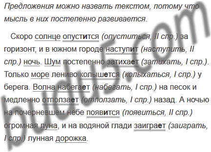 Скоро солнце опуст..тся за горизонт, и в южном городе наступит ночь. Шум постепенно затиха..т. Только море лениво колышется у берега. Волна набега..т на песок и медленно отполза..т назад. А ночью на почерневшем небе появ..тся огромная луна, и на водяной глади заигра..т лунная дорожка.