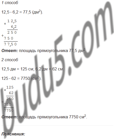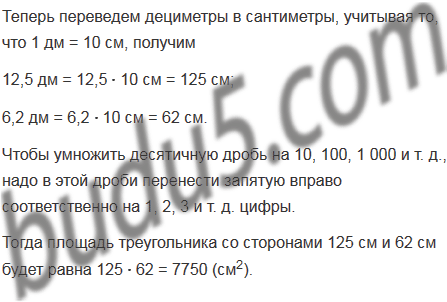 Найдите площадь прямоугольника со сторонами 12,5 дм и 6,2 дм. Решите эту же задачу, переводя дециметры в сантиметры.