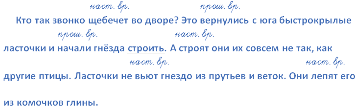 Кто так звонко щ..беч..т во дворе? Это в..рнулись с юга быстрокрылые ласт..чки и нач..ли гнёзда строить. А стро..т они их совсем не так, как другие птицы. Ласт..чки не в..ют гнездо из прут..ев и веток. Они леп..т его из к..мочк..в глины.