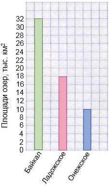 а) Постройте столбчатые диаграммы площади озер и глубины озер Байкал и Ладожское и Онежское.