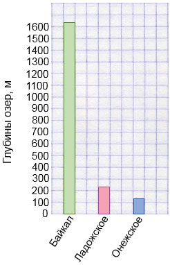 Столбчатая диаграмма глубины озер Байкал, Ладожское, Онежское.