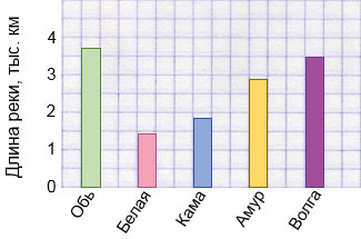Длины рек: Обь - 3700 км, Белая - 1400 км, Кама - 1800 км, Амур - 2800 км, Волга - 3500 км (100 км - 1 мм).