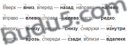 Вверх — ..., вперёд — ..., направо — ..., вправо — ..., справа — ..., часто — ..., вверху — ..., сверху — ..., снаружи — ..., вместе — ..., спереди — ..., вблизи — ... .